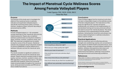 Purpose: The purpose of this study was to investigate the effects of the menstrual cycle on wellness indicators among female volleyball players, specifically examining sleep quality, soreness, nutrition, academic stress, and prior day rating of perceived exertion (RPE). Methods: Female volleyball players (n = 13) completed surveys reporting on their menstrual cycle and any related symptoms. Players also completed wellness questionnaires scoring items related to sleep, soreness, nutrition, academic stress, and RPE. The study was completed over six weeks during the course of the off-season. Statistical analysis was employed using multivariate analysis of variance (MANOVA) to assess differences in wellness indicators across the menstrual cycle. Results: The results revealed no significant variations in wellness indicators across the menstrual cycle phases. Players reported consistent levels of sleep quality, soreness, nutrition, academic stress, and RPE regardless of the phase they were in. The data indicated that academic stress and nutritional intake remained stable throughout the menstrual cycle, while perceived soreness and RPE did not show notable fluctuations. Conclusions: These findings suggest that the menstrual cycle does not exert a measurable impact on the wellness scores of female volleyball players. The implications of this study are significant for coaches and sports professionals, as it allows for the implementation of standardized training and recovery protocols without the need to account for menstrual phases. This study contributes to the understanding of female athlete wellness, indicating that menstrual cycle phases may not be a determining factor in wellness evaluations within a sports context. Practical Applications: With the menstrual cycle not affecting wellness, strength and conditioning coaches can concentrate on other aspects of athlete health and performance, such as technique, strategy, and psychological readiness. In addition, athletes may experience less stress and concern regarding potential menstrual-related performance fluctuations, fostering a more positive training environment and enhancing confidence. Acknowledgements: None