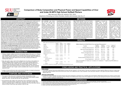 Purpose: To compare the physical characteristics of body composition, speed, and power measurements in high school female fastpitch softball pitchers who throw < 60 mph (SP< 60) and ≥ 60 mph (SP≥60). Methods: Thirteen competitive high school female fastpitch softball pitchers participated in 1 testing session (age: 15.9±1.8 years; mass: 72.0±29.8kg; height: 166.5±2.5cm; softball experience 8.0±2.0 years). Participants were stratified (n=6-7/group – based on a power analyses) into pitchers who throw < 60 mph (SP< 60) and ≥ 60 mph (SP≥60). Body composition lean body mass (LBM) and body fat percentage (BF%) were collected using a bioelectrical impedance scanner (InBody 570). Following body composition analysis, each subject performed a standardized dynamic warm-up. Countermovement vertical jump (CMVJ) height, drop jump (DJ) height, and Reactive Strength Index (RSI; air time ÷ ground time) were measured using a jump map (Skyhook). Distance for a seated chest pass (SCP), sit-up and throw (SUAT), and rotational medicine ball throw (RMBT) was measured using a laser tape measure device (Bosch). Acceleration was measured using a 10-yard dash with a laser timing system (Dashr). Three trials were completed for each test with the best used for analyses. Independent t-tests were used for analyses (p< 0.05), with Cohen’s d effect sizes also calculated and interpreted as small (≥0.2) medium (≥0.5), and large (≥0.8). Results: No significant (p >0.05) differences were seen in body composition for BF% (SP< 60 29.3±8.4% vs SP≥60 25.6±7.5%; d=0.44) or LBM (SP< 60 28.1±3.4kg vs SP≥60 29.1±2.2kg, d=0.34). Lower body power also showed no differences in CMVJ height (SP< 60 45.7±6.1cm vs SP≥60 48.4±3.4cm, d=0.53), DJ height (SP< 60 44.2±6.9kg vs SP≥60 48.8±4.2kg, d=0.76), and RSI (SP< 60 1.1±0.3 vs SP≥60 1.3±0.5, d=0.60). No differences (but moderate to large effect magnitude) were also seen in acceleration (SP< 60 2.09±0.15sec. vs SP≥60 1.97±0.06sec., d=0.93) and the upper body power test of RMBT (SP< 60 6.8±0.6 m vs SP≥60 7.2±0.5 m, d=0.72). In contrast, SP≥60 compared to SP< 60 had greater upper body power measures of SCP (SP≥60 4.3±0.2 m vs SP< 60 4.1±0.2 m, d=1.12) and SUAT (SP≥60 3.9±0.5 m vs SP< 60 3.3±0.3 m, d=1.22). Conclusions: In the sample measured, high school softball pitchers who throw ≥60 mph compared < 60 mph pitchers there were only significant and large magnitude differences observed in certain upper body power measures (SCP and SUAT), but no differences seen in body composition, lower body power measures, or the upper body power measure of RMBT. Practical Applications: A certain level of body composition and upper and lower body power development is warranted to be a competitive high school fastpitch softball pitcher throwing at any velocity, as shown herein. However, for coaches or strength professionals working with high school softball pitchers aiming to play at the collegiate level, upper body power development should be a key training emphasis to assist the athlete in pitching at or above 60 mph. Acknowledgements: None.