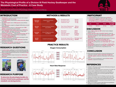 Purpose: This study aimed to examine the physiological demands and performance profile of a Division III field hockey goalkeeper. Methods: A Division III field hockey goalkeeper (22 yo, 165.3cm, 64.1kg, and 24.1%BF) went through several baseline tests including anthropometrics assessing height, weight, and body composition via air density plethysmography (BodPod, Cosmed). Muscular strength was assessed using one repetition maximum (1RM) bilateral back squat and barbell bench press to determine upper and lower body muscular strength. Strength-power assessment was determined by the 1RM hang power clean and absolute power was determined using the Lewis Power Equation from the counter movement vertical jump (CMVJ; JustJump Mat). Anaerobic power was assessed via the 30-second Wingate (WAnT) test and aerobic power was determined by a graded exercise cycle ergometry maximal test (VO2max) using a portable metabolic cart (K5, Cosmed). Following physiological assessment, the subject participated in on-field monitoring of heart rate (H10, Polar) and oxygen consumption via a portable metabolic cart (K5, Cosmed) during two 2-hr off-season training sessions. Results: The participant reported 1RMs of 122.5kg, 65.5 kg, and 77.1 kg for the bilateral back squat, bench press, and hang power clean, respectively. They reported an average power, via the Lewis Equation, of 908.5W from a CMVJ of 42.6cm. From the WAnT, the participant reported a mean power of 556W, a peak power of 641W, with a time to peak power of 10.1sec. Maximum anaerobic capacity and anaerobic power were determined to be 8.7W·kg-1 and 10.0W·kg-1, respectively. Aerobic capacity was determined to be 40.9 ml·kg-1·min-1 with a HRmax of 180bpm. During practice activities, average VO2 was reported to be 15.02 ml·kg-1·min-1 and an average peak of 37.37ml·kg-1·min-1, with an average HR of 123bpm and an average peak HR of 167bpm. Conclusions: Strength values put the participant in the 90th percentile ranks of female Division I college athletes and greater than 1SD of the reported means for CMVJ height of national-level women soccer and lacrosse athletes. Compared to normative values, the participant reports in the 70th percentile for maximum aerobic capacity for her age group. Practice intensity was determined to be 36.7% of VO2max, with a peak reporting of 91.35% of VO2max with an average heart rate of 64% of HRmax. Practical Applications: Goalkeepers are an underrepresented group in research due to low numbers on teams and equipment and movement restraints of the position. Understanding their unique profile, skills, and demands can help develop specific training programs. Field hockey goalkeepers experience high levels of strength, power, anaerobic capacity, and aerobic demands during practices and require training to address these demands in preparation for the sport. Acknowledgements: None
